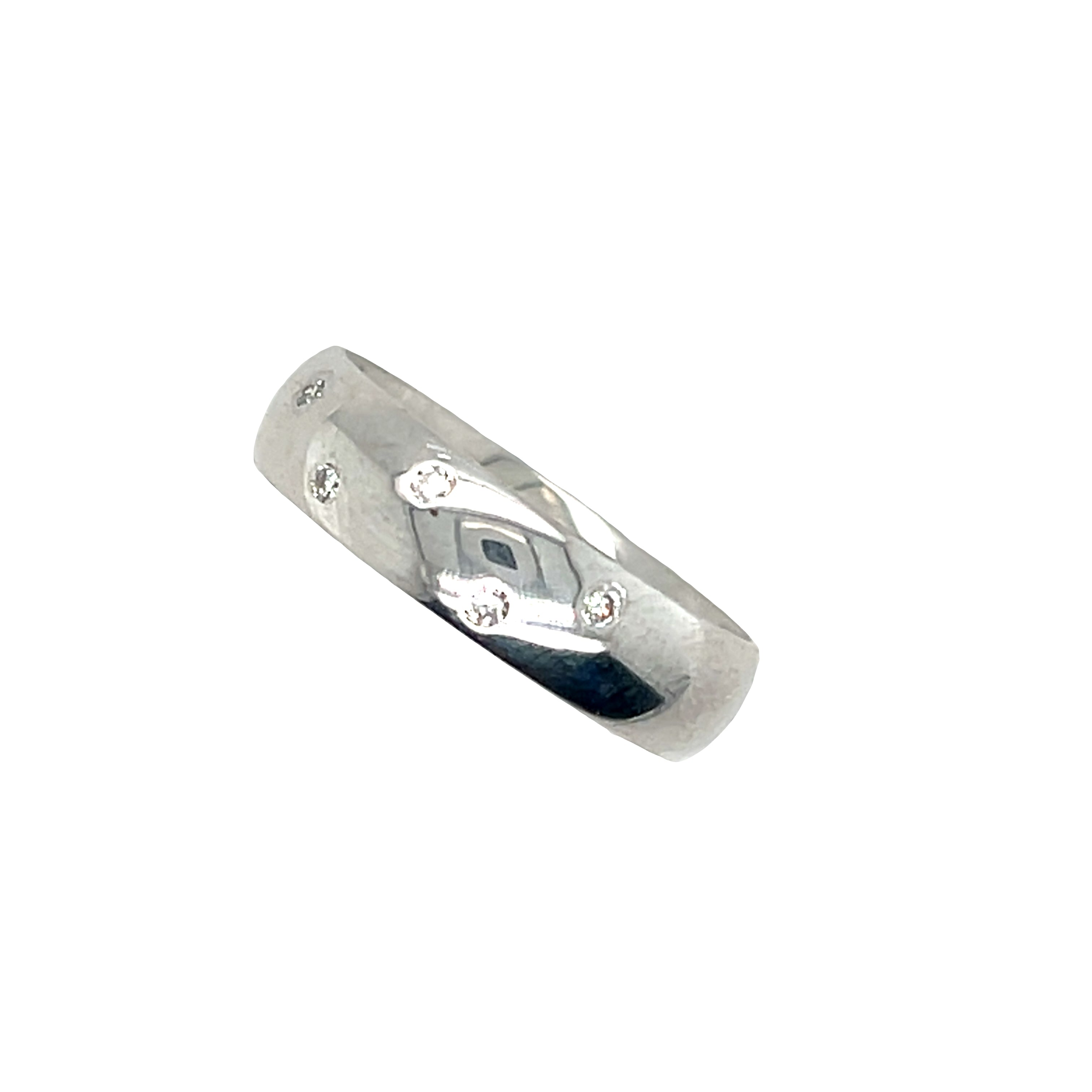Exquisitely crafted band ring fashioned from lustrous 18ct white gold, offering a sleek, contemporary design. The ring is elegantly studded with brilliant cut natural diamonds, each meticulously set to maximize light reflection and sparkle. A minimalist yet sophisticated piece, perfect for everyday wear or as a refined statement of commitment.