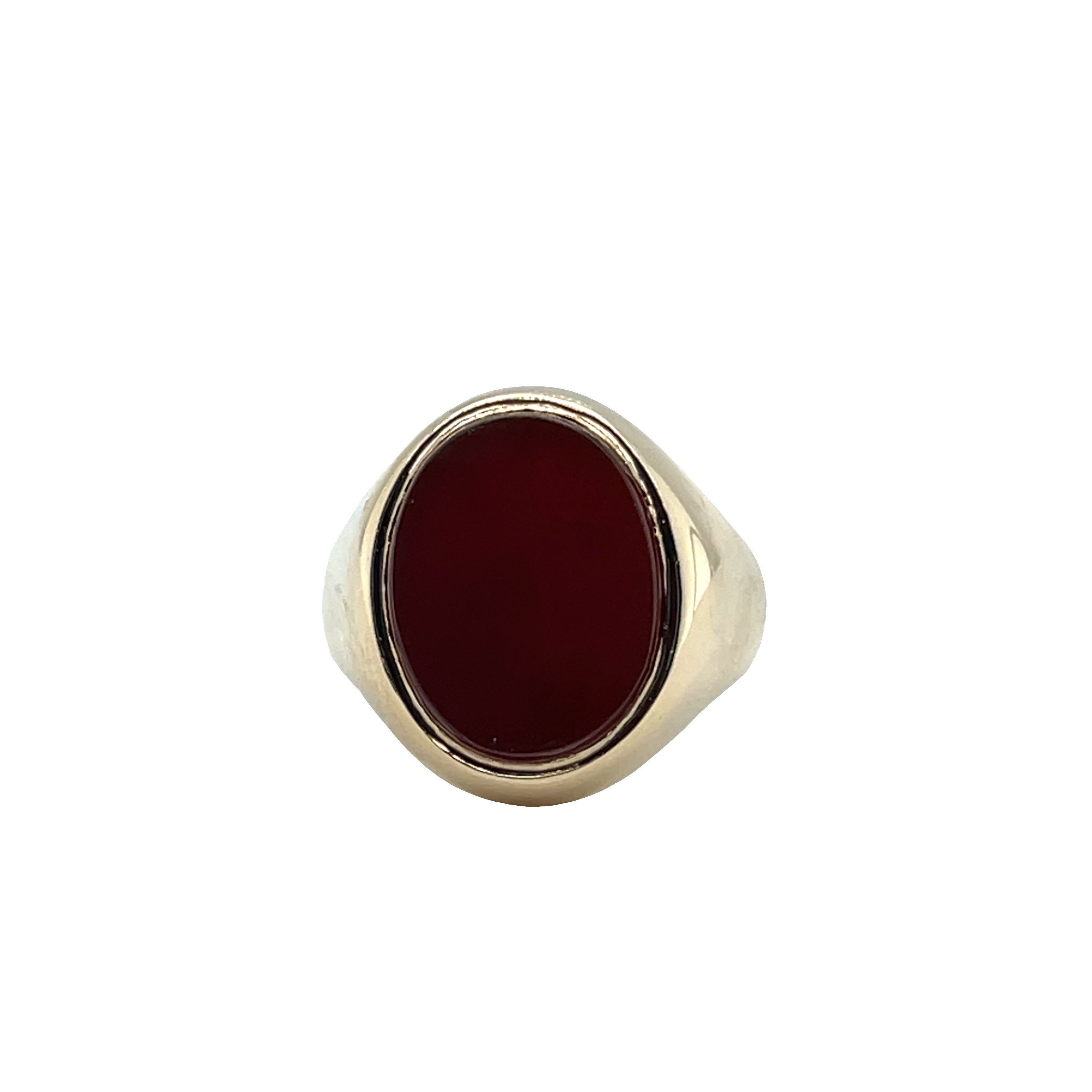 Exude sophistication with this striking signet ring, meticulously crafted from rich 9ct yellow gold. At its centre, a captivating oval cabochon cut carnelian steals the spotlight with its deep red hue. This distinguished ring is more than an accessory, it's a statement of refined taste and timeless elegance.