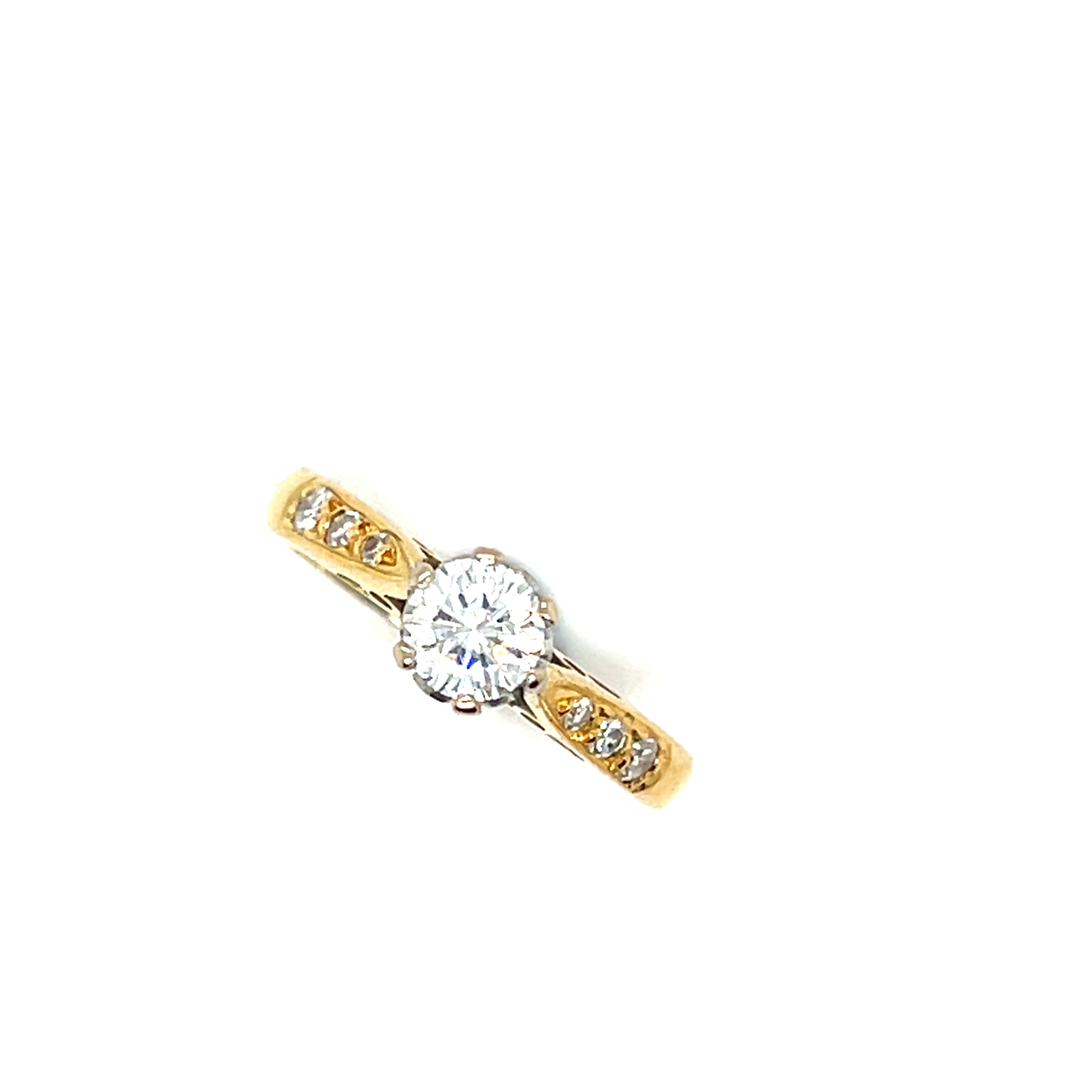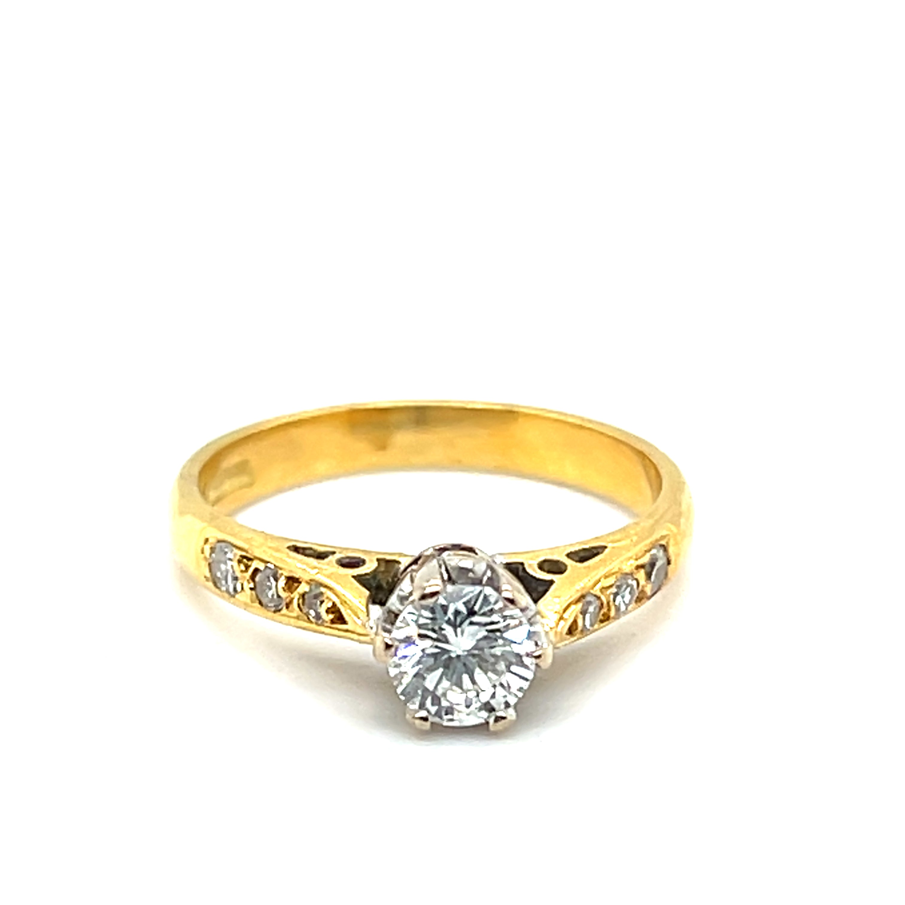 Exquisitely crafted, this multistone ring showcases a .38ct Round Brilliant Cut Natural Diamond, set in a meticulously detailed 18ct yellow gold band. The ring features openwork designs along the shoulders adding an element of vintage charm and sophistication. A harmonious blend of classic design and refined elegance, this ring is a timeless treasure.