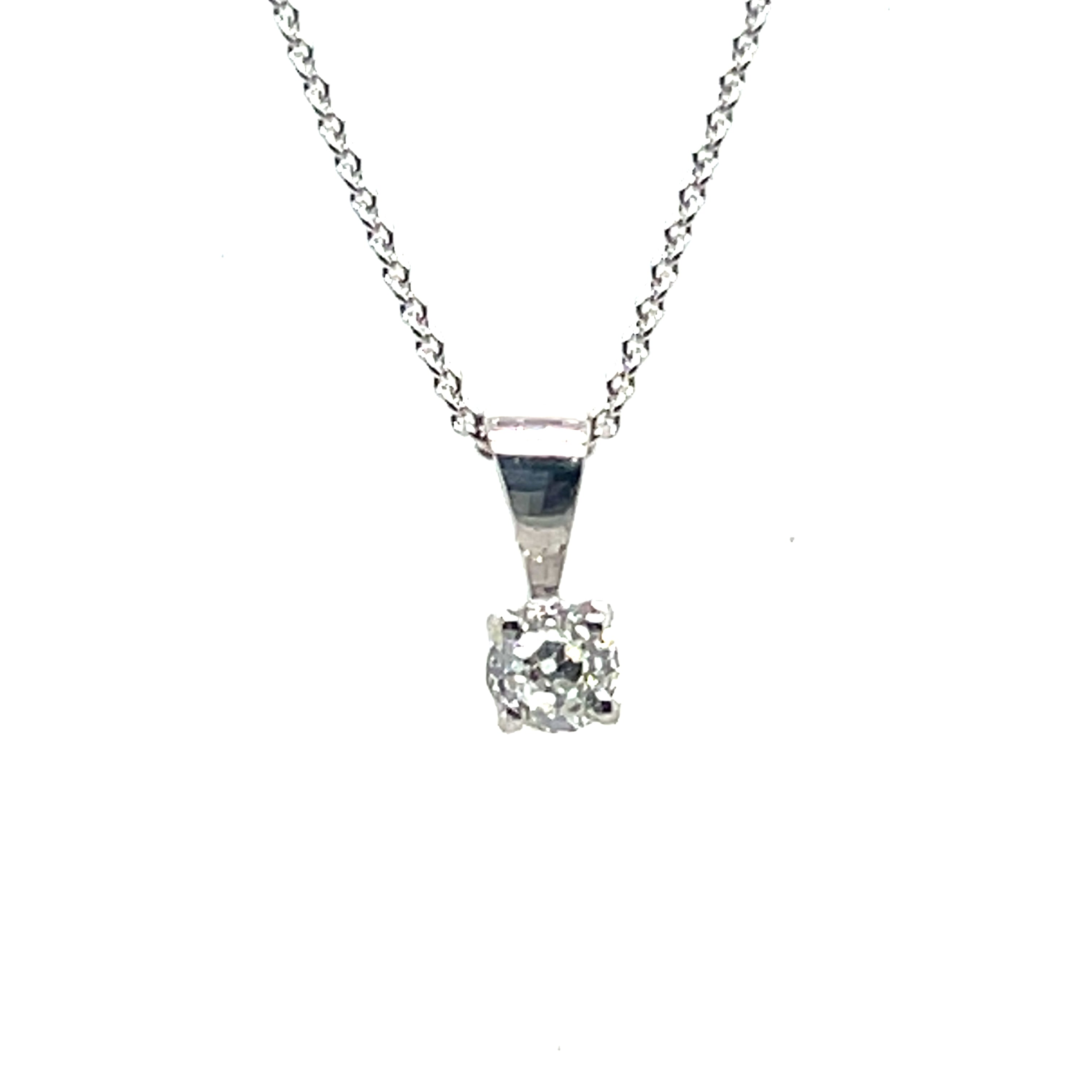 Exquisitely crafted, this pendant showcases a .22ct Old Cut Natural Diamond set in a sleek, 9ct white gold setting. The pendant hangs gracefully from a delicate 9ct white chain, creating a timeless piece perfect for adding a touch of understated elegance to any ensemble.