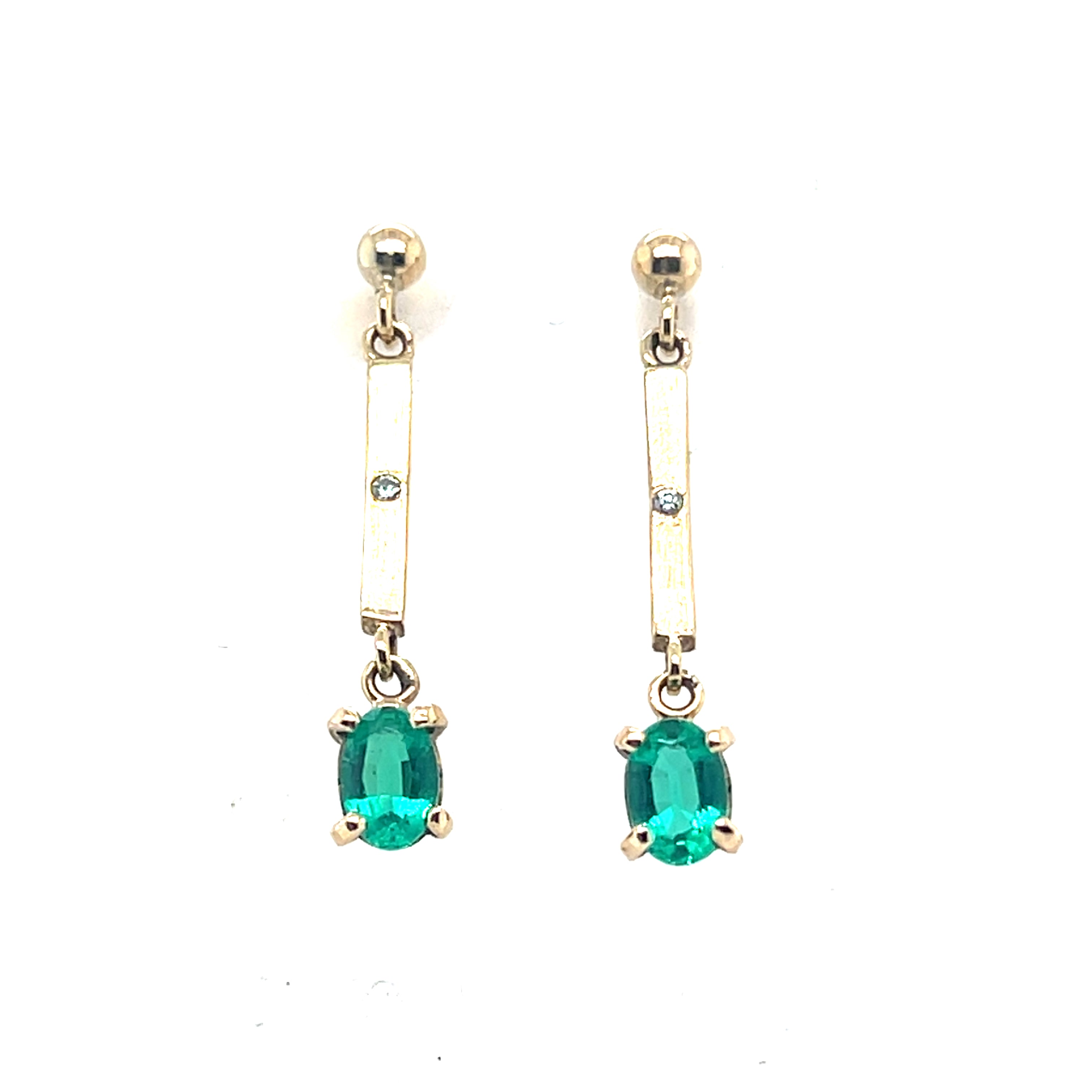 Elevate your style with these elegant dangle earrings, meticulously crafted in warm 9ct yellow gold. Each earring features a captivating oval cabochon synthetic emerald and a round brilliant cut natural diamond, known for its vibrant green hue and smooth, polished surface. These earrings offer a refined and sophisticated look, perfect for adding a touch of classic charm to any ensemble.